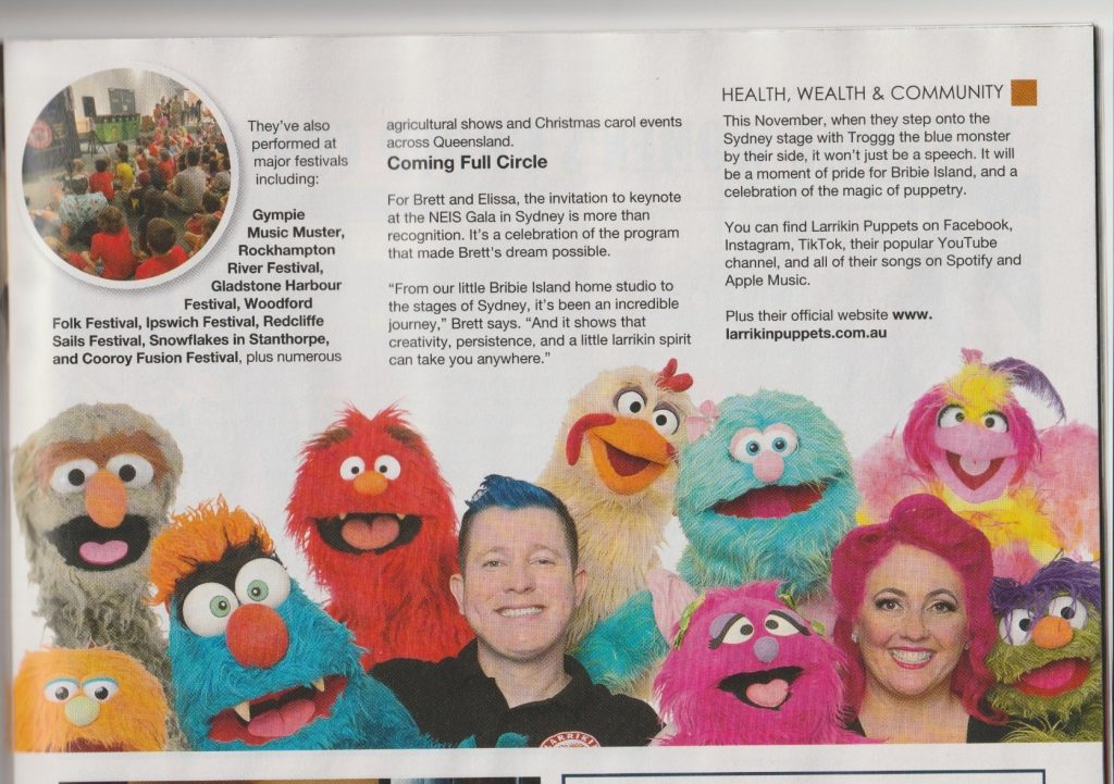 This November, the PARKROYAL Darling Harbour ballroom in Sydney will host an extraordinary celebration – and at the heart of it are Bribie Island’s own Larrikin Puppets. Puppeteers Brett Hansen and his wife Elissa Jenkins have been invited to be keynote speakers at the 40th Anniversary Gala of the New Enterprise Incentive Scheme (NEIS) and Self-Employment Assistance. What began in 2012 as a small idea has grown into a national success story in live theatre, television, and music – and it all started with a blue puppet.